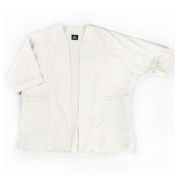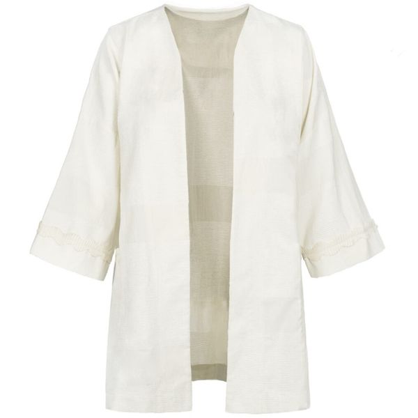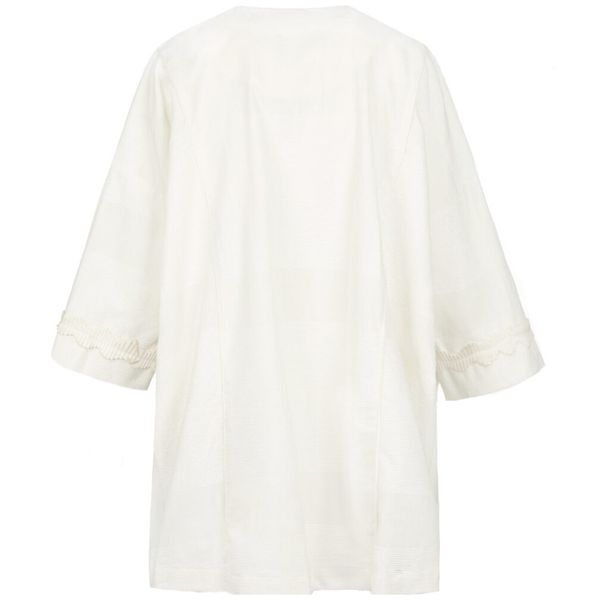 این محصول، یک مانتوی تک رنگ شیری با طراحی مینیمال و ساده است.