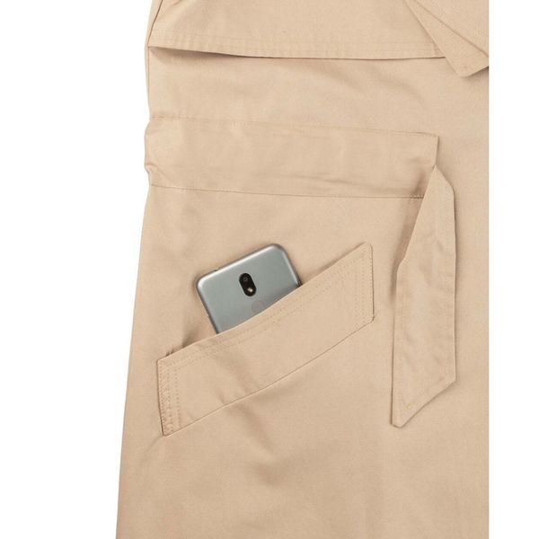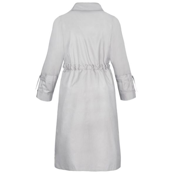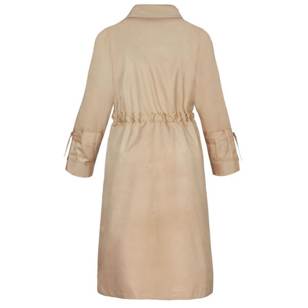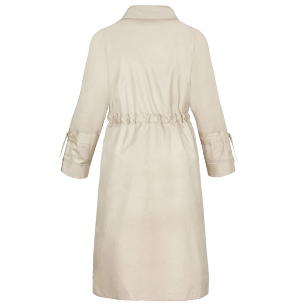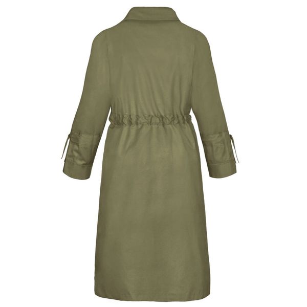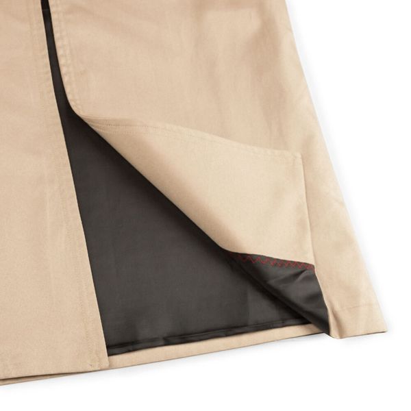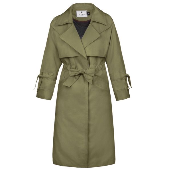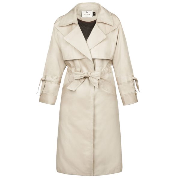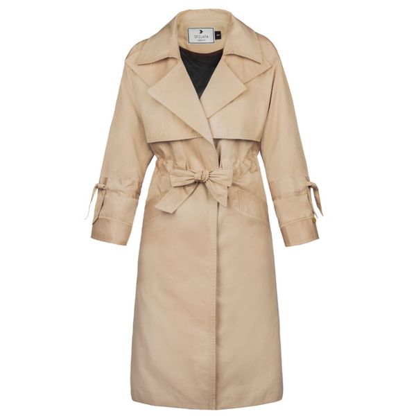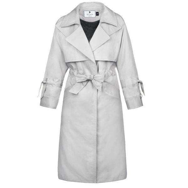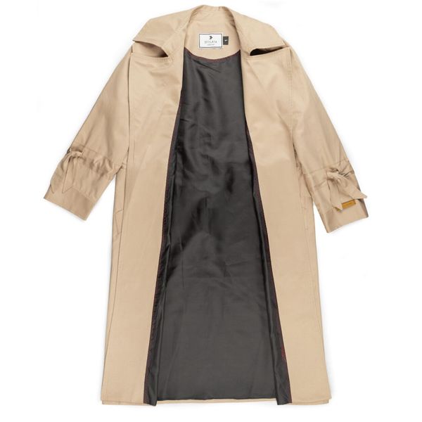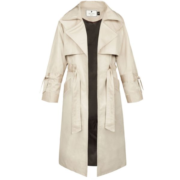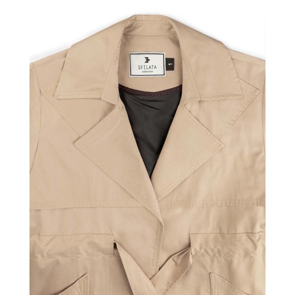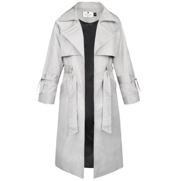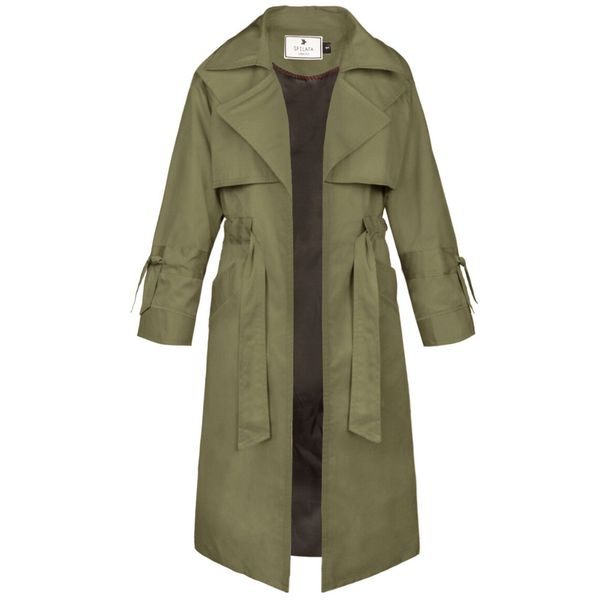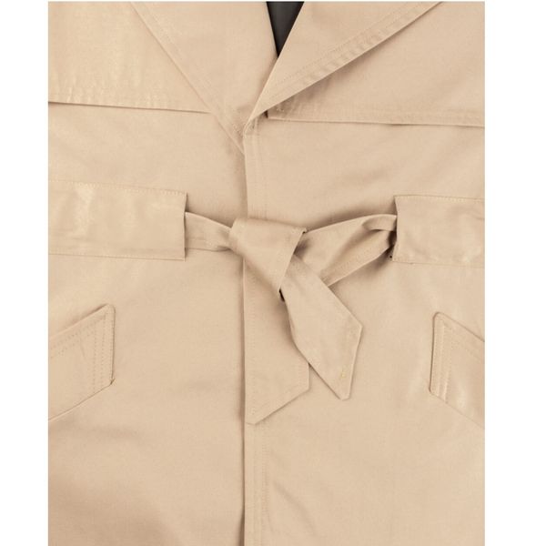 این بارانی جلوباز است که به وسیله ی یک کمربند به جنس خود لباس، میتوان آن را بست.
